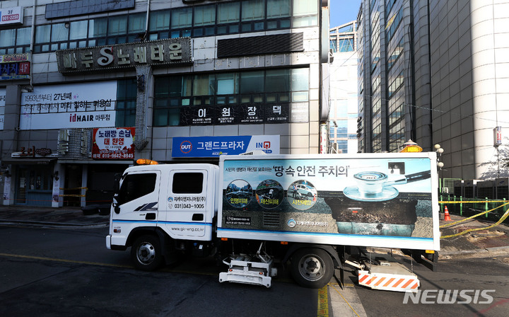 [고양=뉴시스] 홍효식 기자 = 3일 경기도 고양시 마두역 인근 지하 기둥 파손과 지반 침하로 붕괴 위험이 있는 상가 건물 앞에서 노면하부 탐사차량이 정밀진단을 하고 있다. 2022.01.03. [email protected]