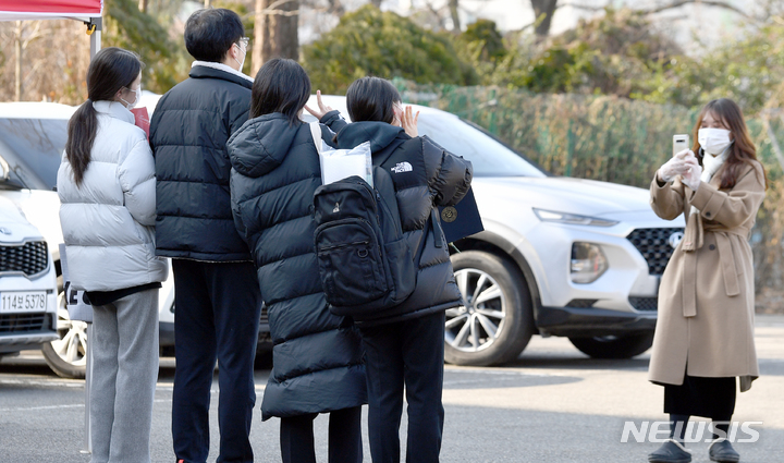 [광주=뉴시스] 류형근 기자 = 코로나19가 지속되고 있는 가운데 4일 오전 광주 남구 모 중학교 주차장에서 교사와 제자들이 마지막 기념사진을 찍고 있다. 2022.01.04. [email protected]