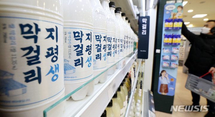 [서울=뉴시스] 홍효식 기자 = 지평주조가 막걸리 대표 제품인 '지평 생 쌀막걸리'의 편의점 판매 가격을 20% 인상했다. 장수막걸리, 국순당에 이어 막걸리 가격이 줄줄이 오르고 있다. 업체들은 쌀값 등 각종 원·부자재 가격이 인상되고, 비용 상승 요인이 작용돼 가격을 올릴 수밖에 없다는 입장이다. 4일 서울 한 마트에 진열된 지평 생 쌀막걸리. 2022.01.04. [email protected]