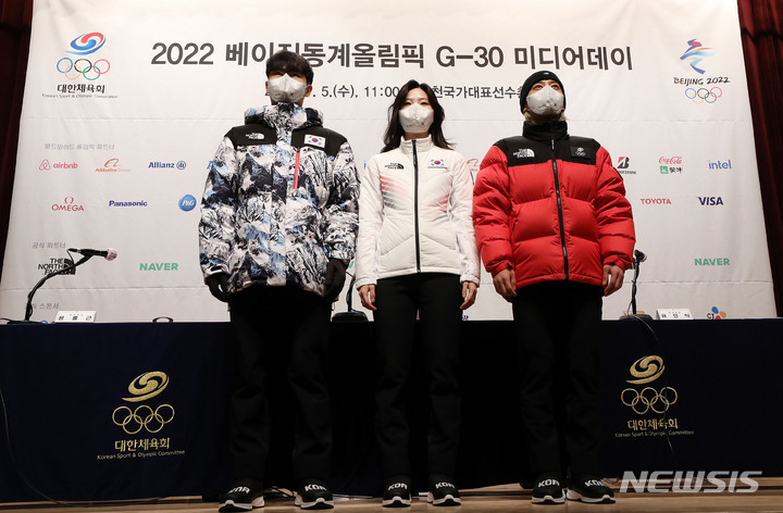 [진천=뉴시스] 홍효식 기자 = 5일 충청북도 진천군 진천국가대표선수촌에서 열린 2022 베이징동계올림픽 G-30 미디어데이 합동 기자회견에서 김민석(왼쪽부터), 이유빈, 곽윤기 선수가 국가대표 공식 단복을 소개하고 있다. 2022.01.05. [email protected]