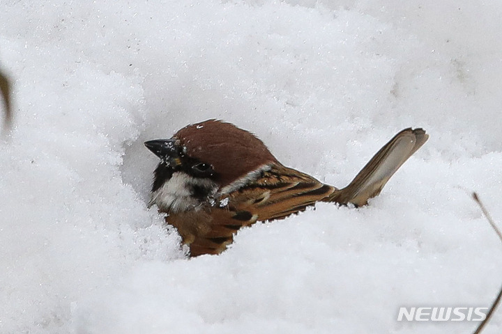 [서울=뉴시스] 권창회 기자 = 절기상 '소한(小寒)'인 5일 오후 서울 시내 한 공원에서 참새들이 눈 위에 자리를 잡고 있다. 2022.01.05. [email protected]