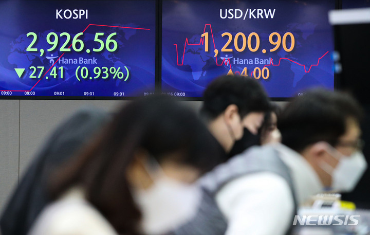 [서울=뉴시스] 권창회 기자 = 코스피가 전 거래일(2,953.97)보다 28.57포인트(0.97%) 내린 2,925.40에 개장한 6일 오전 서울 중구 하나은행 딜링룸 전광판에 지수가 표시되고 있다. 코스닥 지수는 전 거래일(1,009.62)보다 16.02포인트(1.59%) 내린 993.60, 원·달러 환율은 전 거래일(1196.9원)보다 4.0원 오른 1200.9원에 출발했다. 2022.01.06. [email protected]