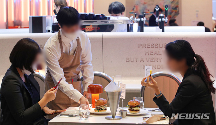 [서울=뉴시스] 권창회 기자 = 7일 오전 서울 송파구 잠실 롯데월드몰 내 고든 램지 버거 매장에서 직원이 버거를 서빙하고 있다. 전 세계 네 번째이자 아시아 최초로 문을 연 고든 램지 버거 잠실점은 지난달 30일 프리 오픈을 거쳐 오늘 정식 오픈했다. 2022.01.07. [email protected]