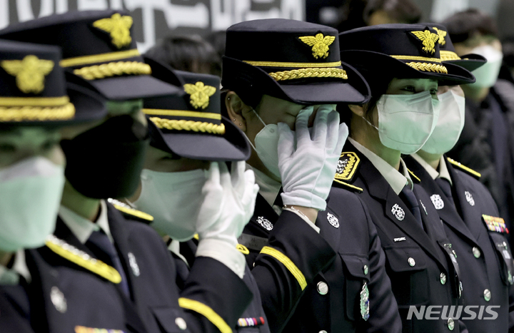 [평택=뉴시스] 경기사진공동취재단 = 8일 오전 경기 평택시 이충문화체육센터에서 경기도청장으로 진행된 순직 소방공무원 합동 영결식에서 동료 소방관들이 눈물을 흘리고 있다. 2022.01.08. [email protected]