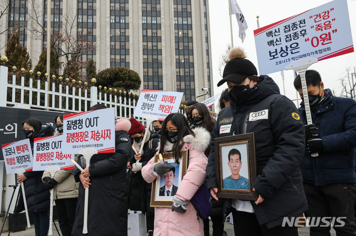 [서울=뉴시스] 권창회 기자 = 코로나백신피해자가족연합 회원들이 8일 오후 서울 종로구 정부서울청사 앞에서 열린 백신패스 철회 집회에서 피해자들을 위한 묵념을 하고 있다. 2022.01.08. [email protected]