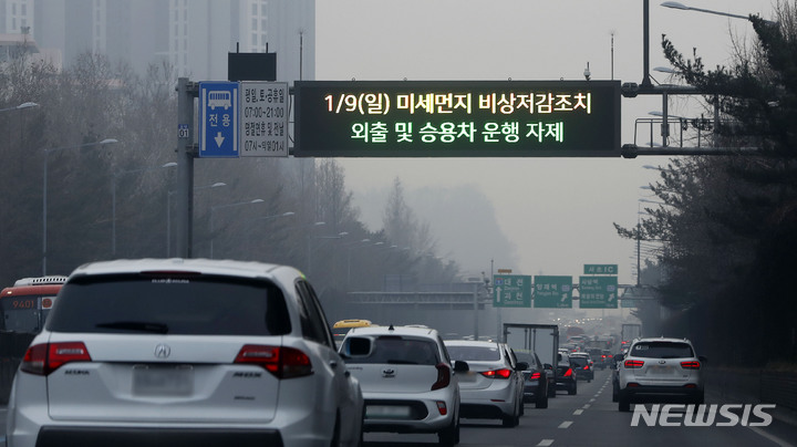 [서울=뉴시스] 홍효식 기자 = 서울 등 수도권에 고농도 미세먼지 비상저감조치가 시행된 9일 서울 서초 ic 인근 경부고속도로 전광판에 미세먼지 비상저감조치 관련 외출 및 승용차 운행 자제 안내문이 나오고 있다. 2022.01.09. [email protected]