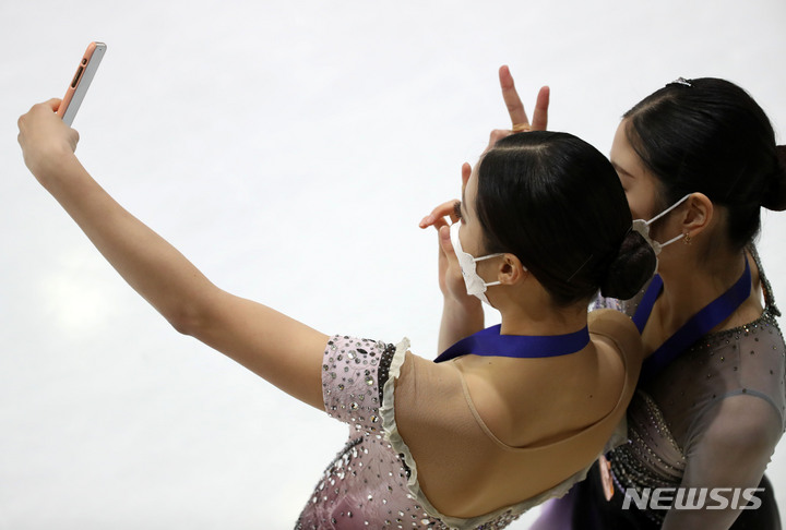 [의정부=뉴시스] 고범준 기자 = 9일 오후 경기도 의정부 실내빙상장에서 열린 KB금융 코리아 피겨스케이팅 챔피언십 2022(제76회 전국 남녀 피겨스케이팅 종합선수권대회 겸 2022년 베이징 동계 올림픽 대표 2차 선발전)에서 1위를 차지한 유영이 이해인과 셀카를 찍고 있다. 2022.01.09. [email protected]