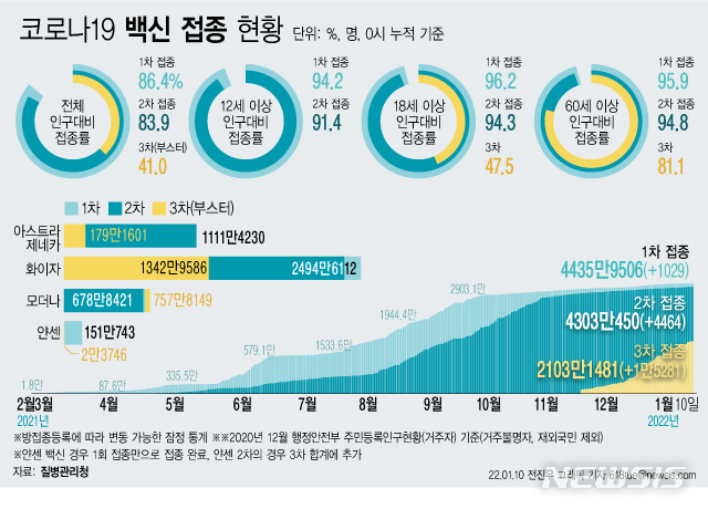 [서울=뉴시스] 코로나19 예방접종대응추진단에 따르면 10일 0시 기준 3차 접종자는 1만5281명 늘어 총 2103만1481명이다. 3차 접종자는 전체 인구(2021년 12월 행정안전부 주민등록인구현황) 대비 41% 수준이다. 18세 이상 성인 중에서는 47.5%, 60세 이상 고령자 중에서는 81.1%가 3차 접종을 마쳤다. (그래픽=전진우 기자)