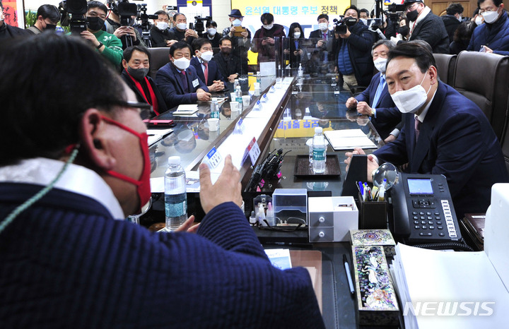 [서울=뉴시스] 국회사진기자단 = 윤석열 국민의힘 대선 후보가 10일 서울 용산구 대한노인회를 방문해 김호일 회장 등과 간담회를 하고 있다2022.01.10. [email protected]