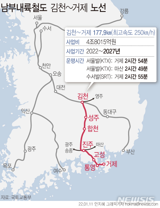 [서울=뉴시스] 김천에서 거제를 잇는 남부내륙철도 기본계획이 확정됐다. 오는 2027년까지 단선철도 177.9㎡(최고속도 250㎞/h)를 연결하고 5개 역이 신설된다. 철도가 완공되면 영남 서부지역이 수도권에서 KTX(1일 25회)로 2시간 50분대에 연결이 가능하게 된다. (그래픽=안지혜 기자)