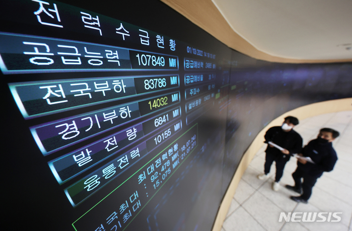 [수원=뉴시스] 김종택기자 = 연일 계속되는 한파로 전력수요가 급증하고 있는 13일 오후 경기도 수원시 한국전력공사 경기지역본부 전력관리처 계통운영센터에서 관계자들이 전력수급 현황을 실시간으로 점검하고 있다. 2022.01.13.