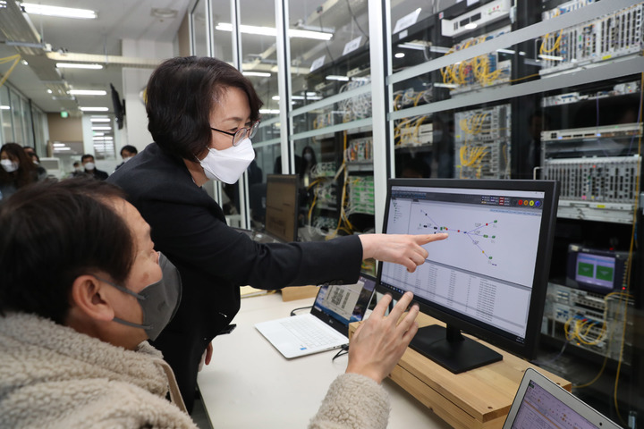임동진 HFR 부장으로부터 flexiHaul 광전송장비 운영정보에 대한 설명을 듣고 있다. (사진= 과학기술정보통신부 제공) 2022.01.13.