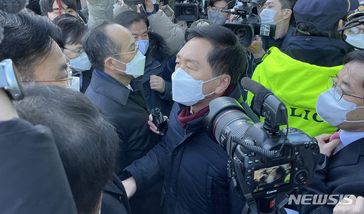 [서울=뉴시스] 국회사진기자단 = 김기현 국민의힘 원내대표 등이 14일 윤석열 대선 후보 부인 김건희씨의 7시간 통화 녹취록을 보도할 예정인 서울 마포구 MBC를 항의 방문하고 있다. 2022.01.14. [email protected]