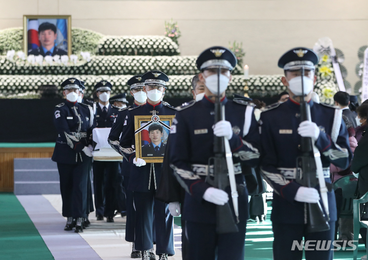 [수원=뉴시스] 경기사진공동취재단 = KF-5E 전투기 추락 사고로 순직한 고(故) 심정민(29·공사64기) 소령의 영결식이 엄수된 14일 오전 경기도 수원시 공군 제10전투비행단에서 운구행렬이 국립대전현충원으로 향하고 있다. 2022.01.14.