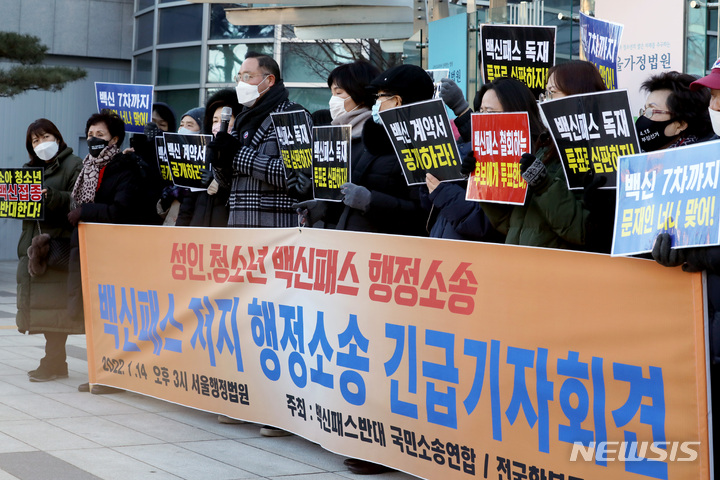 [서울=뉴시스] 김병문 기자 = 백신패스반대국민소송연합과 전국학부모단체연합 회원들이 14일 오후 서울 서초구 서울행정법원 앞에서 백신패스 저지 행정소송 긴급 기자회견을 하고 있다. 2022.01.14. [email protected]