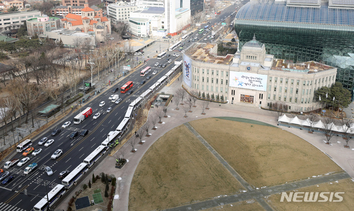 [서울=뉴시스] 김병문 기자 = 전국민주노동조합총연맹 등 진보 단체들이 서울 도심 대규모 집회를 예고한 15일 오전 서울 중구 서울시청 인근에 경찰 버스 차벽이 설치돼 있다. 2022.01.15. [email protected]