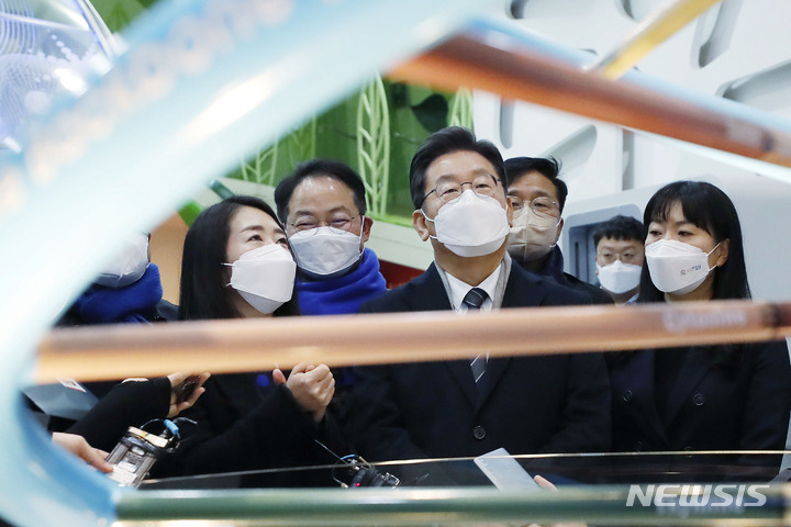 [홍천=뉴시스] 최동준 기자 = 이재명 더불어민주당 대선 후보가 15일 강원 홍천생명건강과학관을 방문해 전시 시설을 살펴보고 있다. 2022.01.15. [email protected]