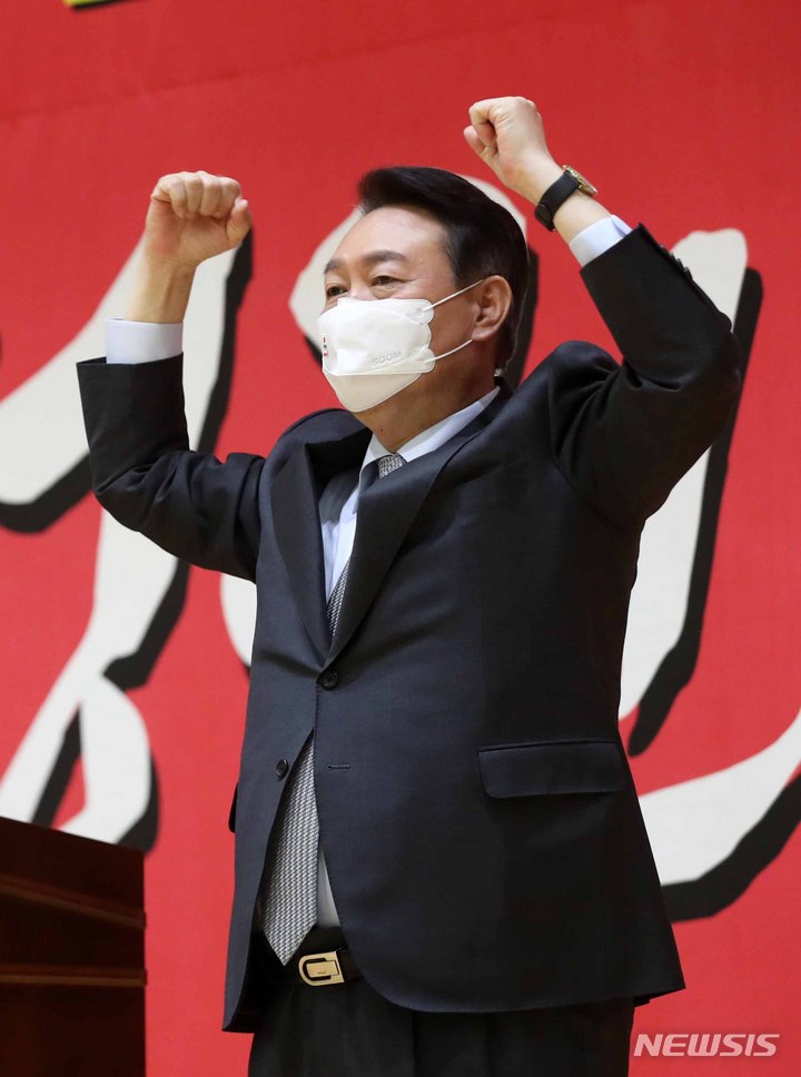 [울산=뉴시스] 김선웅 기자 = 윤석열 국민의힘 대선 후보가 15일 울산 전하체육센터에서 열린 울산 선거대책위원회 필승결의대회에서 필승을 다짐하고 있다. 2022.01.15. [email protected]