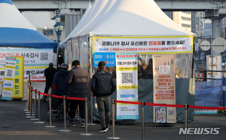 [서울=뉴시스] 고범준 기자 = 코로나19 신규 확진자가  4194명으로 집계된 16일 오전 서울 중구 서울역광장에 마련된 코로나19 중구임시선별검사소에서 시민들이 검사를 받기 위해 줄 서 있다. 위중증 환자는 612명으로 사흘째 600명대를 유지했다. 2022.01.16. [email protected]