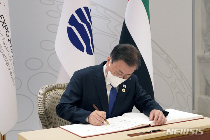 [두바이=뉴시스] 김진아 기자 = UAE를 방문 중인 문재인 대통령이 16일 오후(현지시간) 두바이 엑스포에서 UAE관 방문을 마친 뒤 방명록을 작성하고 있다. 2022.01.17. [email protected]