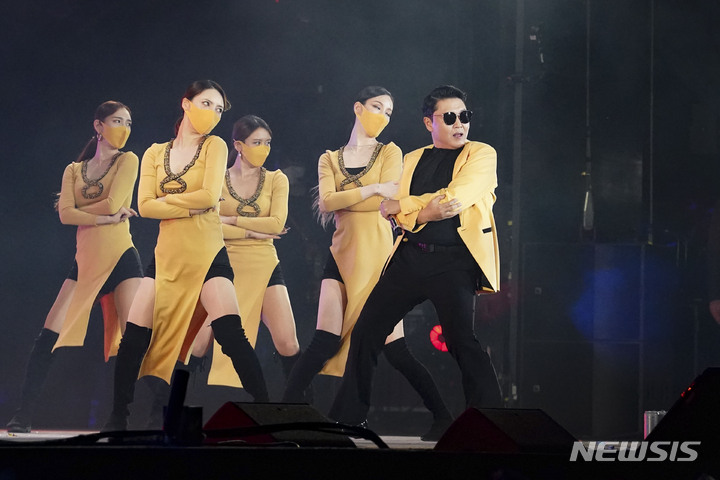 [두바이=뉴시스] 김진아 기자 = 문재인 대통령과 김정숙 여사가 참석한 가운데 16일(현지시간) 아랍에미리트 두바이 엑스포 쥬빌리공원에서 열린 K-POP 콘서트에서 가수 싸이가 공연을 하고 있다. 2022.01.17. [email protected]