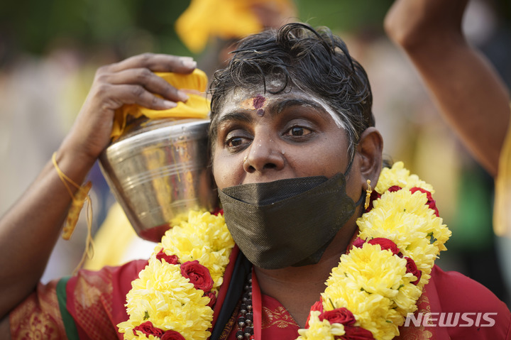 [쿠알라룸푸르=AP/뉴시스] 18일(현지시간) 말레이시아 쿠알라룸푸르 외곽 바투 동굴에서 힌두교 축제 '타이푸삼'이 열려 마스크를 쓴 한 힌두교 신자가 우유 항아리 '팔 쿠담'을 어깨에 이고 고행하고 있다. 힌두교 전쟁의 신 무루간을 기리는 타이푸삼 축제에서 신자들은 한 해 동안 지은 죄를 참회하며 등, 가슴, 혀 등에 쇠꼬챙이와 갈고리를 꿰거나 짐을 들고 행진하는 참회 의식을 한다. 2022.01.18.