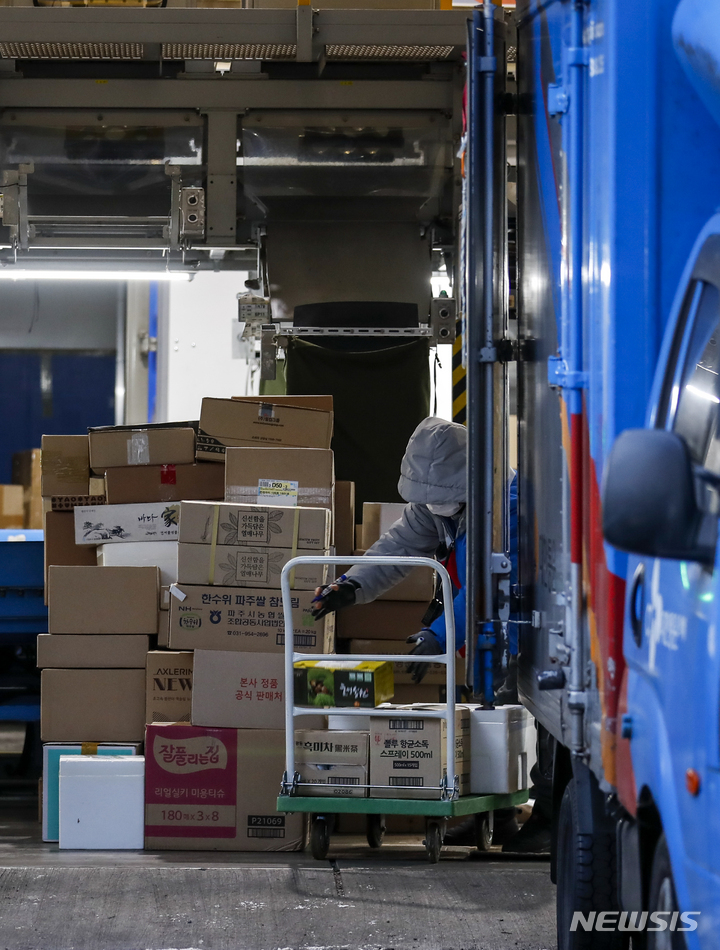 [서울=뉴시스] 정병혁 기자 = 민주노총 전국택배노조 CJ대한통운본부의 파업이 3주째 이어지고 있는 18일 오전 서울의 한 CJ대한통운 물류센터에서 직원이 택배 분류작업을 하고 있다. 2022.01.18. [email protected]
