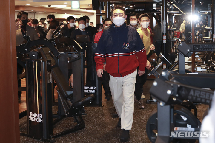 [서울=뉴시스] 전신 기자 = 윤석열 국민의힘 대선 후보가 18일 서울 강남구 한 실내 피트니스 센터를 방문해 실내체육시설 종사자들과 간담회를 마친 후 운동을 위해 이동하고 있다. 2022.01.18. [email protected]