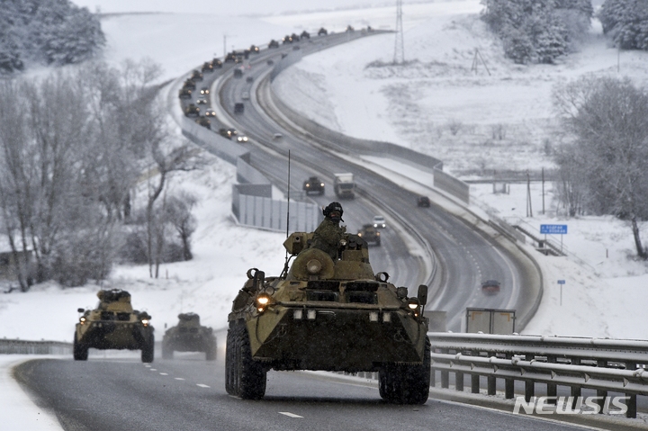 [키예프=AP/뉴시스] 러시아 장갑차 행렬이 18일(현지시간) 우크라이나 영역 크림반도의 한 고속도로를 따라 이동하고 있다. 러시아는 우크라이나 인근에 탱크와 기타 중화기를 보유한 10만 명의 병력을 집결시켰으며 북대서양조약기구(NATO) 옌스 스톨텐베르그 사무총장은 유럽 내 전쟁 발발의 긴박함을 우려했다. 2022.01.19.