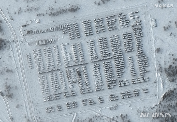 [보로네시=AP/뉴시스] 맥사 테크놀로지스가 제공한 위성사진에 19일(현지시간) 러시아 보로네시 포고노보 훈련장에 러시아군 차량이 집결해 있다. 조 바이든 미국 대통령은 러시아가 우크라이나를 침공할 경우 '값비싼 대가'를 치를 것이라고 경고했다. 2022.01.20.
