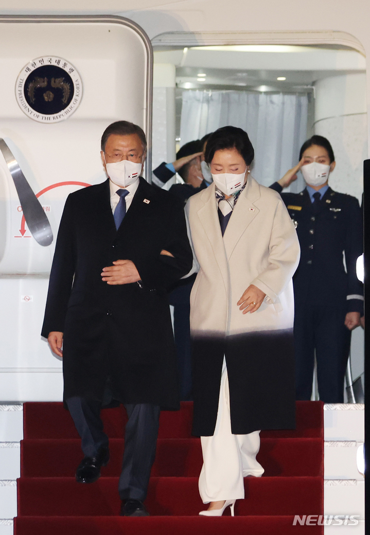 [카이로=뉴시스] 김진아 기자 = 아랍에미리트(UAE), 사우디아라비아, 이집트 등 중동 3개국 순방 중인 문재인 대통령과 부인 김정숙 여사가 19일(현지시간) 이집트 카이로 국제공항에 도착해 공군 1호기에서 내리고 있다. 2022.01.20. [email protected]