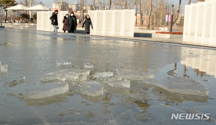 [전주=뉴시스] 김얼 기자 = 24절기 중 마지막 절기인 대한을 맞이한 20일 전북 전주시 전북대학교 분수대가 강추위로 꽁꽁 얼어붙어 있다. 2022.01.20. [email protected]