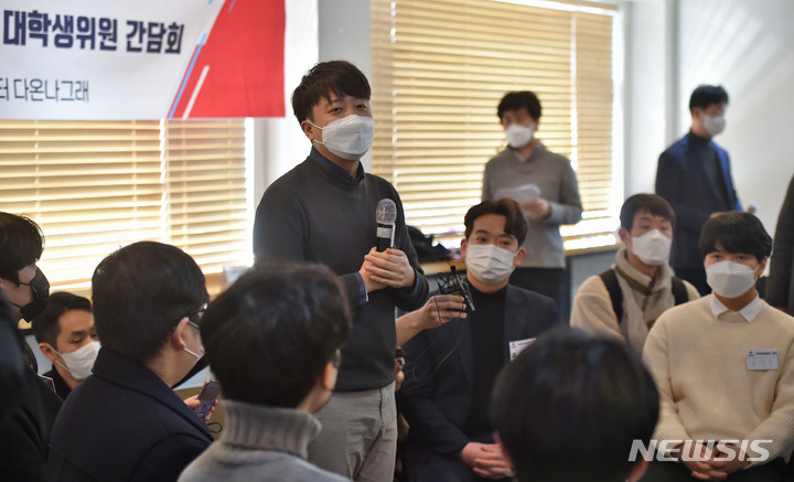 [대구=뉴시스] 이무열 기자 = 이준석 국민의힘 대표가 20일 오후 대구 북구 '대구청년센터 다온나그래'에서 열린 국민의힘 경북캠퍼스 총회 및 대구시당·경북도당 대학생위원 간담회에서 인사말을 하고 있다. 2022.01.20. [email protected]