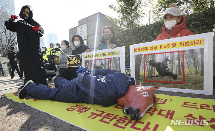 [서울=뉴시스] 최진석 기자 = 한국동물보호연합 회원들이 21일 서울 여의도 KBS 앞에서 'KBS 드라마 태종 이방원의 낙마 동물학대 살상 행위 규탄 기자회견'을 하며 KBS를 규탄하는 퍼포먼스를 하고 있다. 2022.01.21. [email protected]