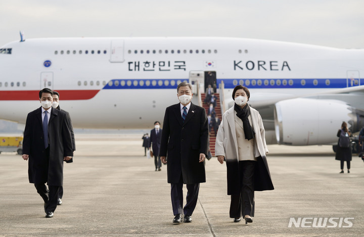 [성남=뉴시스] 김진아 기자 = 아랍에미리트(UAE), 사우디아라비아, 이집트 등 중동 3개국 순방을 마친 문재인 대통령과 부인 김정숙 여사가 22일 경기 서울공항에 도착해 공군 1호기에서 내려 이동하고 있다. 2022.01.22. [email protected]