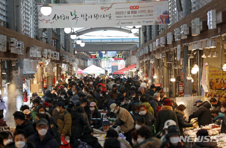 [서울=뉴시스] 조성우 기자 = 소상공인시장진흥공단에 따르면 올해 설 차례상 비용(4인 기준)은 평균 전 전통시장(26만 2,645원)이 대형마트(34만 1,859원)에 비해 7만 9,214원 가량 저렴한 것으로 나타났다. 설 명절을 일주일 앞둔 23일 서울 동대문구 청량리 종합시장이 장을 보는 시민들로 북적이고 있다. 2022.01.23. [email protected]