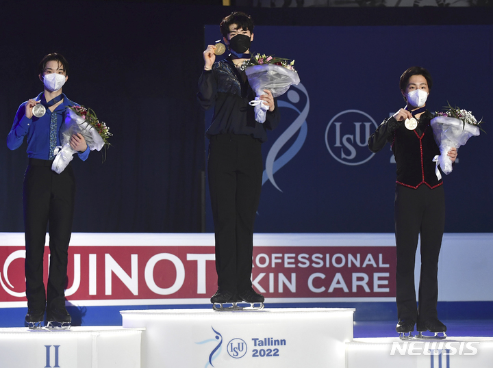 [탈린=AP/뉴시스] 차준환(가운데)이 23일(현지시간) 에스토니아 탈린의 톤디라바 아이스 홀에서 열린 2022 국제빙상연맹(ISU) 4대륙선수권대회에서 우승한 후 시상대에 올라 금메달을 들고 포즈를 취하고 있다. 차준환은 남자 싱글 프리스케이팅에서 기술점수(TES) 86.48, 예술점수(PCS) 88.78로 174.26점을 받아 전날 쇼트 프로그램 98.96점과 합쳐 273.22점으로 우승해 한국 선수 사상 처음으로 4대륙 대회 메달을 따냈다. 2022.01.24.
