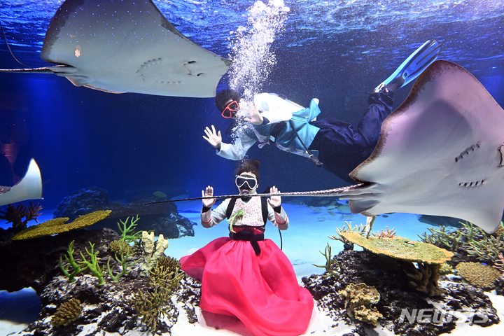 [수원=뉴시스] 김종택기자 = 설 연휴를 앞둔 24일 오전 경기도 수원시 영통구 아쿠아플라넷 광교 수조에서 한복을 입은 아쿠아리스트들이 수중 퍼포먼스를 진행하고 있다. 2022.01.24.