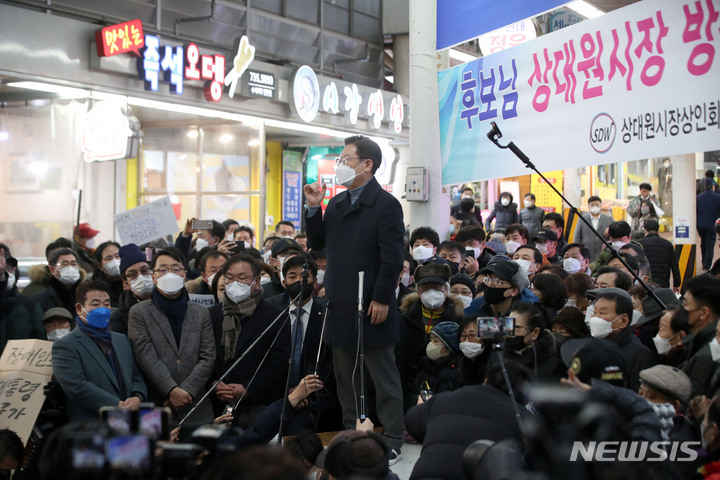 [성남=뉴시스] 김선웅 기자 = 이재명 더불어민주당 대선 후보가 24일 오후 경기 성남시 중원구 상대원시장에서 열린 '매타버스' 성남, 민심속으로! 행사에서 시민들과 만나 연설을 하고 있다. 2022.01.24. [email protected]