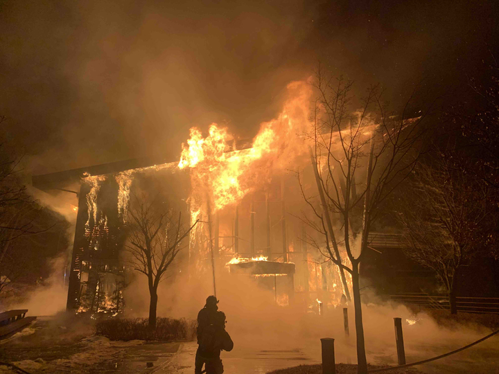 [양양=뉴시스] 김경목 기자 = 25일 오전 강원 양양소방서 소방관들이 양양군 양양읍 월리 송이밸리 자연휴양림 내 목재문화체험장에서 발생한 화재를 진압하고 있다. 목조 건물 1동이 전소돼 5억 원(소방서 추산)의 피해가 났다. (사진=양양소방서 제공) 2022.01.25. [email protected]