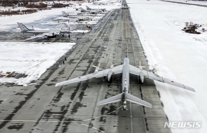 [모스크바=AP/뉴시스] 24일(현지시간) 러시아 공군의 Tu-95 전략폭격기가 러시아 볼가강 인근 엥겔스 공군기지에서 이륙 준비를 하고 있다. 우크라이나를 둘러싼 긴장감이 동유럽 전체로 확산하면서 북대서양조약기구(NATO) 국가들이 선박·전투기 배치를 강화하는 상황에서 미국도 자국 병력 배치를 준비한다고 공식 거론했다. 2022.01.25.
