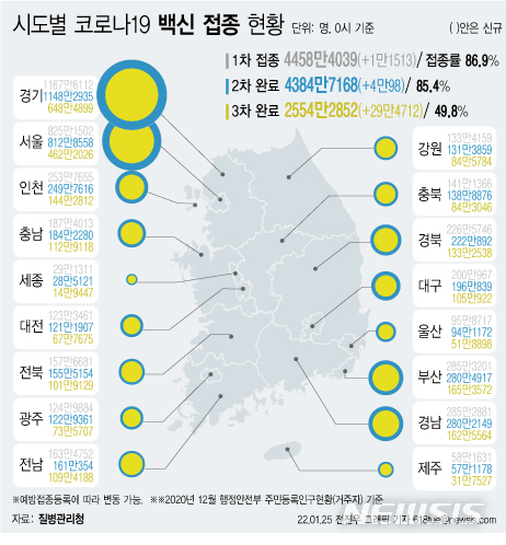 [서울=뉴시스] 25일 코로나19 예방접종 대응 추진단에 따르면 시도별 누적 3차 접종자 수는 경기도가 648만4899명으로 가장 많고, 이어 서울 462만2026명, 부산 165만3572명, 경남 162만5564명 등이다. 지역별로 3차 접종률이 높은 곳은 전남 59.9%로 가장 높다. (그래픽=전진우 기자)