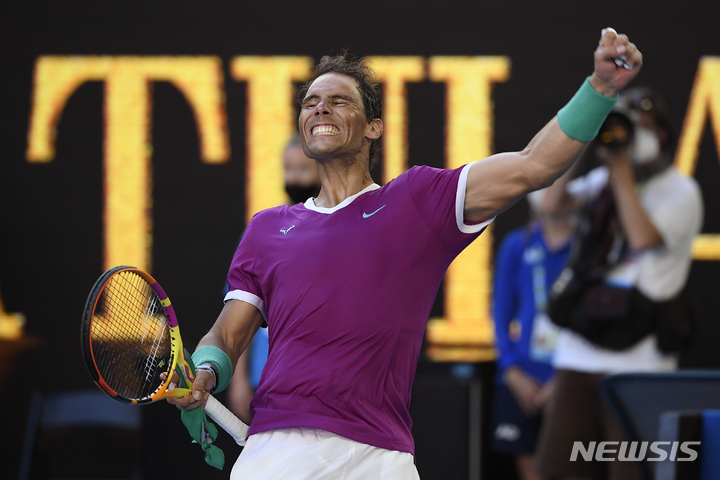 [멜버른=AP/뉴시스] 라파엘 나달(5위·스페인)이 25일(현지시간) 호주 멜버른에서 열리고 있는 호주오픈 남자 단식 8강전에서 데니스 샤포발로프(14위·캐나다)를 물리치고 환호하고 있다. 나달은 샤포발로프를 세트 스코어 3-2(6-3 6-4 4-6 3-6 6-3)로 물리치고 준결승에 올랐다. 2022.01.25.