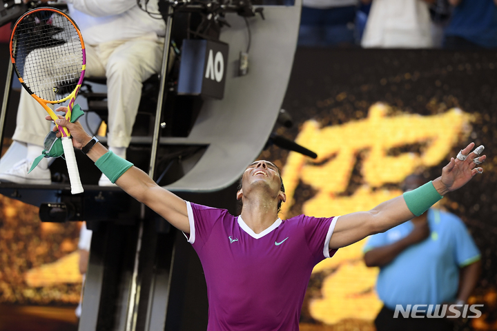 [멜버른=AP/뉴시스] 라파엘 나달(5위·스페인)이 25일(현지시간) 호주 멜버른에서 열리고 있는 호주오픈 남자 단식 8강전에서 데니스 샤포발로프(14위·캐나다)를 물리치고 환호하고 있다. 나달은 샤포발로프를 세트 스코어 3-2(6-3 6-4 4-6 3-6 6-3)로 물리치고 준결승에 올랐다. 2022.01.25.