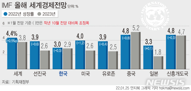 [서울=뉴시스] 국제통화기금(IMF)이 오미크론 변이 확산 등의 영향으로 세계 경제 성장세가 예상보다 둔화될 것으로 내다봤다. 한국의 올해 경제 성장률 전망치를 3.0%로 제시했다. 지난해 10월 보고서와 비교해 0.3%포인트(p) 하락한 수치다. (그래픽=안지혜 기자)