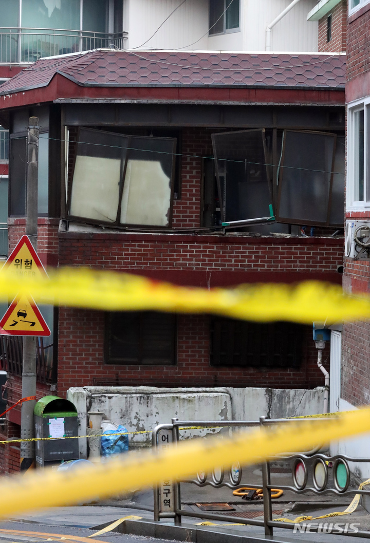[서울=뉴시스] 고승민 기자 = 25일 서울 금천구 독산동에 위치한 한 빌라의 발코니가 벽면에서 분리돼 지면을 향해 기울어져 있다. 소방당국은 전날 신고를 받고 이 빌라 주민과 인근 빌라 주민들을 대피시킨 상태다. 금천구청은 이 발코니를 철거할 방침이다. 2022.01.25. [email protected]