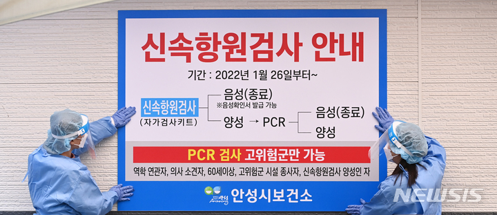 [안성=뉴시스] 김종택기자 = 25일 오후 경기도 안성시보건소에 마련된 선별검사소에서 관계자들이 신속항원검사 안내문을 붙이고 있다. 오미크론이 우세한 전남, 광주, 안성, 평택 등 4개 지역에서는 26일부터 코로나19 유전자 증폭(PCR) 검사를 밀접촉자, 60세 이상 고령층 등 고위험군만 받을 수 있다. 유증상자를 포함한 그외 대상자는 선별진료소에서 자가검사키트로 검사를 한 뒤 양성이 나오면 PCR 검사를 받게 된다. 2022.01.25.