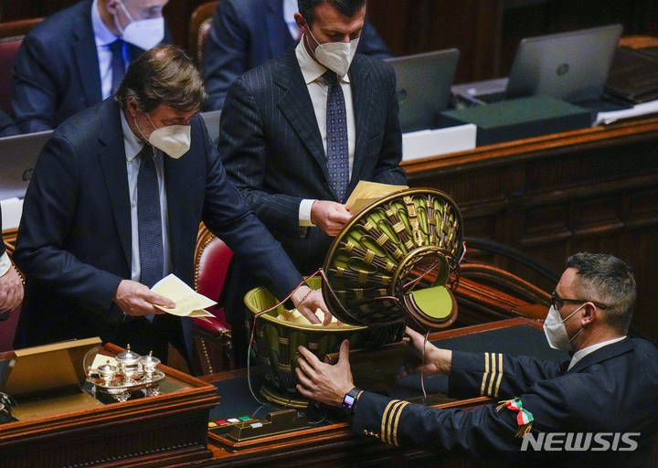 [로마=AP/뉴시스] 25일(현지시간) 이탈리아 로마의 하원 의사당에서 이탈리아 대통령 선거 2차 투표 후 투표함이 개봉되고 있다. 앞서 진행된 1차 투표는 1009명의 대의원 중 672명이 백지 투표용지를 제출해 당선자가 확정되지 않았다. 2022.01.26.