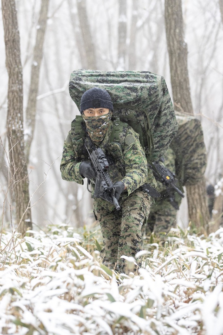 [서울=뉴시스] 지난 25일 강원도 평창 황병산 훈련장에서 육군특전사 비호부대 특전요원들이 침투 및 특수정찰을 하고 있다. 육군 특전사는 오는 3월까지 부대별 9박 10일 일정으로 설한지 극복훈련을 한다. (사진=육군 제공) 2022.01.26. [email protected] *재판매 및 DB 금지
