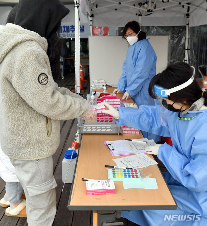 [광주=뉴시스] 류형근 기자 = 코로나19 오미크론 변이바이러스 급증으로 광주지역 검사방식이 고위험군 중심으로 변경된 26일 오전 광주 서구 선별진료소 옆에 설치된 '신속항원검사소'에서 검사자가 자가검사키트를 이용해 스스로 검사를 하고 있다. 2022.01.26. [email protected]
